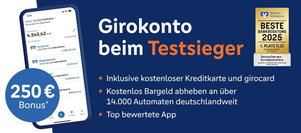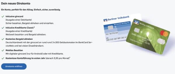 Das Girokonto der Berliner Volksbank kommt mit starker Neukundenaktion: Ihr zahlt im ersten Jahr 0,00€ Kontopreis (statt 3,95€ mtl.) – und on top gibt’s satte 150€ Neukundenbonus bei Online-Eröffnung. Die Aktion läuft vom 27.10.2025 bis 24.11.2025. Neukunde ist, wer in den letzten 12 Monaten keine Kundenverbindung bei der Berliner Volksbank hatte. Minderjährige und Mitarbeitende sind ausgeschlossen. PS: Man muss kein Berliner sein um hier Kunde zu werden 😉