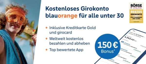 - Zeitraum: 27.10.2025–24.11.2025. Konto online eröffnen (Girokonto oder blauorange) für Bonus-Teilnahme.