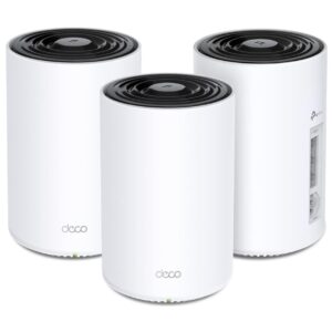 Das 3er-Pack des Deco PX50 sorgt für eine WLAN-Abdeckung von bis zu 600 Quadratmetern und kann mehr als 150 Geräte gleichzeitig unterstützen – ideal für große Haushalte. Die einfache Einrichtung, die Kompatibilität mit gängigen Internetdienstanbietern und die Verbesserung der Netzwerksicherheit durch WPA3 und TP-Link HomeShield sind zusätzliche Vorteile. Für eine Erweiterung eures Mesh-Netzwerks könnt ihr unkompliziert weitere Deco-Einheiten hinzufügen. Beachtet nur, dass der Deco PX50 direkt an einer Wandsteckdose anzuschließen und nicht in der Nähe von großen Haushaltsgeräten aufzustellen ist.