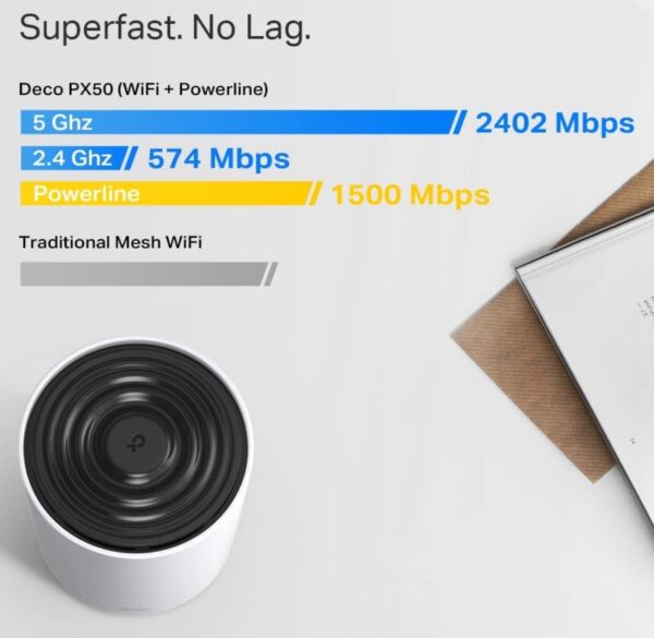 Wenn ihr in einem Haus lebt, in dem dicke oder metallverstärkte Wände das WLAN-Signal schwächen, könnte der Deco PX50 eine gute Lösung sein. Dieses Gerät arbeitet mit dem G.hn-Standard der nächsten Generation, der Störungen minimiert und eine zuverlässige Datenübertragung auch über größere Distanzen von bis zu 300 Metern ermöglicht.Ein weiteres Highlight des Deco PX50 ist die Kombination aus G.hn Powerline-Technologie und Wi-Fi 6, die zusammen für hohe Netzwerkgeschwindigkeiten sorgen. Mit Datenraten von bis zu 2402 Mbit/s über 5 GHz und 574 Mbit/s über 2,4 GHz, plus Powerline-Geschwindigkeiten von bis zu 1500 Mbit/s, bietet es eine gute Grundlage für anspruchsvolle Anwendungen wie Online-Gaming und 8K-Streaming.