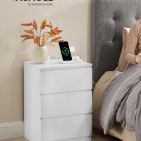 Dank der eingebauten Steckdosenleiste mit 2 Steckdosen und 2 USB-Anschlüssen kannst du dein Handy, Tablet oder Laptop direkt am Tisch aufladen. Einfach praktisch – ob im Schlafzimmer oder Wohnzimmer. Der Tisch bietet dir richtig viel Platz: Oben kannst du deine Lampe, Bücher oder dein Glas Wasser abstellen. Und die 3 Schubladen sind perfekt, um Kleinigkeiten wie Brille, Ladegerät oder deine Lektüre zu verstauen. Der Tisch ist aus robustem Material gefertigt und kann locker bis zu 45 kg tragen. Er wird dir also lange Freude bereiten.