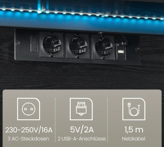 Die Maße von 178 x 35 x 30 cm sorgen dafür, dass es nahezu in jeden Raum passt. Mit der integrierten Steckdosenleiste, die drei AC-Steckdosen und zwei USB-A-Anschlüsse beinhaltet, habt ihr ausreichend Anschlüsse für eure elektronischen Geräte direkt am Board.