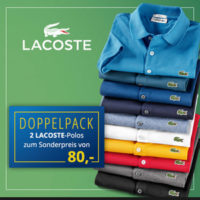 Im Onlineshop von Hirmer könnt ihr Euch aktuell viele verschiedene Polos von Lacoste für jeweils nur 38€ sichern, was zwar kein Mega-Schnäppchen ist – aber leider sind diese ja so gut wie nie im Angebot. Wenn Ihr den Doppelpack für 80€ bestell, könnt Ihr noch den 10€ Newsletter-Gutschein einlösen (ab 80€) und zahlt somit nur 70€ + 5,95€ Versand, also effektiv 38€ pro Shirt: