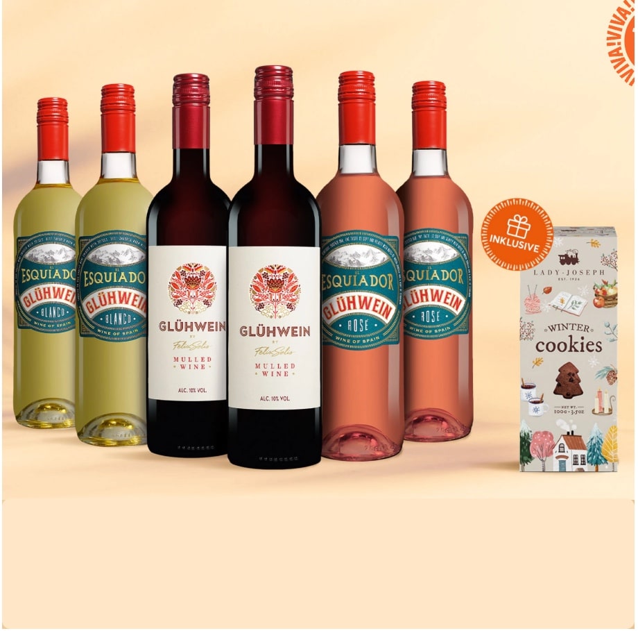 Für die Liebhaber klassischer Aromen bietet das Paket den Glühwein von Félix Solís, eine Cuvée aus edelsüßen Weinen, die mit ihrer intensiven Fruchtigkeit und Gewürzen wie Zimt und Nelken den Geschmack der Winterzeit einfangen. Ein weiterer Pluspunkt: Alle Weine sind vegan und zeigen die harmonische Verbindung aus spanischen Weintraditionen und auserwählten Gewürzen. Um das Geschmackserlebnis abzurunden, enthält das Paket auch die köstlichen Lady Joseph Winter Cookies, die mit ihrer schokoladigen Note die perfekte Begleitung zu den Glühweinen darstellen.