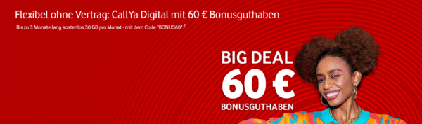 Roland F 16.08.2023, 18:19Aktion gültig vom 15.08.2023 bis 19.09.2023: Bestellst Du als Online-Neukund:in mit dem Code „BONUS60“ im Aktionszeitraum eine Freikarte mit dem Tarif CallYa Digital, schenken wir Dir ein Bonus-Guthaben von 60€ – nach erfolgreicher Identifizierung und Aktivierung.
