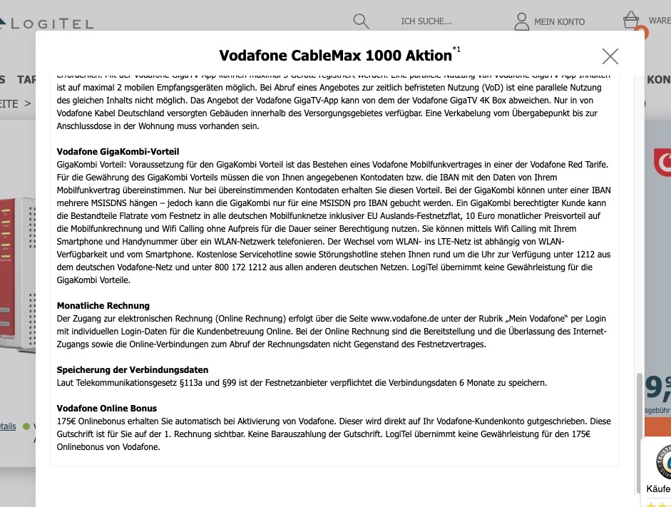 Logitel bietet den Vodafone Cable Max für dauerhaft 49,99€ mtl. an. Dazu gibt es die FRITZ!Box 6690 (Wert: 267€) und den Fritz Repeater 2400 (90€ lt idealo) und ihr bekommt die gesamten Anschlusskosten geschenkt. Überprüft am besten vorab HIER, ob und welcher Anschluss bei euch vor Ort möglich ist. Der Vorteil hier ist, dass der Preis dauerhaft bei 49,99€ mtl .liegt, auch nach 2 Jahren Laufzeit.
