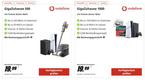Schaut mal her, was MediaMarkt für ein Hammer-Angebot parat hat! Ihr könnt jetzt den Vodafone GigaZuhause 500 Kabel Internettarif für schlappe 19,99€ monatlich in den ersten 12 Monaten abstauben, danach kostet der Tarif im 2. Jahr 54,99€ pro Monat, das macht die fette Prämie aber wieder wett!