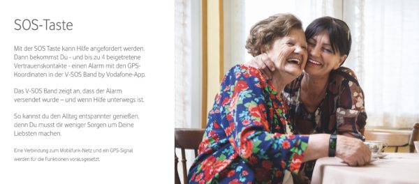Nach dem durchaus beliebten V-Pet Haustier-Tracker gibt es jetzt auch einen neuen Deal zum V-SOS Band von Vodafone: Der Tracker richtet sich an Personen mit älteren und beeinträchtigten Menschen in ihrem Umfeld, um diesen bei einem Notfall ggfs. unterstützen zu können. Das Armband bietet neben einem Monat Akkulaufzeit auch eine Surzerkennung, welche einen Alarm und den Standort des Trägers an euer Smartphone sendet: