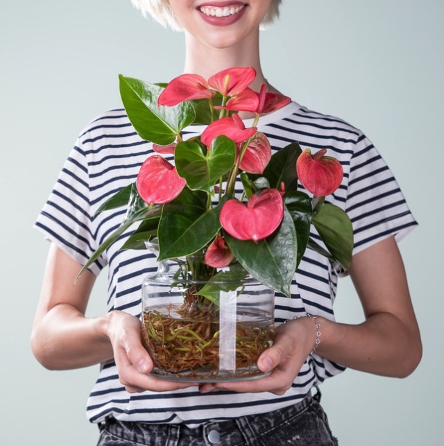 Pflanzen verbreiten Harmonie und sind ein schöner Eyecatcher in jedem Raum. Dies trifft insbesondere auf die hübsche Water Plant Anthurie in Rosa mit passender Glasvase zu. Die Pflanze erreicht den Empfänger mit einer Wuchshöhe von ca. 35 cm. Sie liebt einen hellen Standort ohne direkte Sonneneinstrahlung.