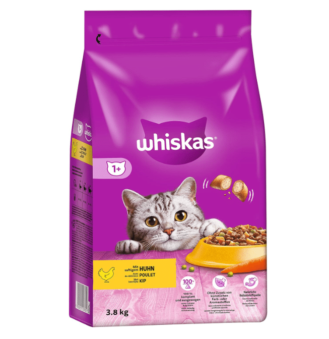 Für alle Katzenhalter unter euch, gibt es gerade bei Amazon ein gutes Angebot, welches wahrscheinlich viele Katzen happy machen wird. Ihr bekommt dort aktuell das Whiskas Adult 1+ Trockenfutter Huhn im 3,8kg Beutel für erwachsene Katzen im Spar-Abo mit kostenlosem Prime Versand für 7,63€. Der Vergleichspreis liegt bei 12,49€.