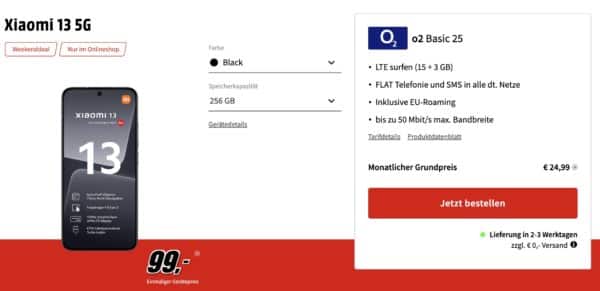 Ihr wollt ein neues Smartphone und habt ein Auge auf das Xiaomi 13 geworfen? Dann hat Media Markt jetzt einen coolen Deal für euch. Ihr bekommt das neue Xiaomi 13 für einmalig 79€ 99. Dazu habt ihr einen Tarif mit 18GB LTE mit einer Allnet Flat im o2 Netz für 24,99€ mtl.