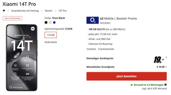 [Vorbei][TOP] Xiaomi 14T Pro (512GB) für 19€ + 100GB 5G/LTE Allnet für 19,99€/Monat (o2 Mobile L)