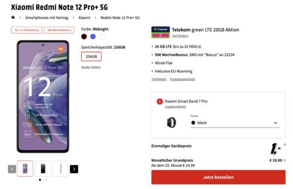 Telekom📱Xiaomi Redmi Note 12 Pro+ mit Xiaomi Smart Band 7 Pro für 1€ + 20GB LTE Allnet für 19,99€ + 50€ RNM-Bonus