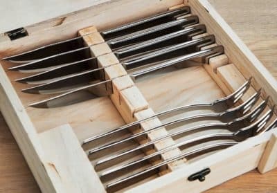 „Ich habe das Steakbesteck zum Verschenken gekauft. Die Holzverpackung macht einen guten aber nicht hochwertigen Eindruck, da sie sehr dünn ist. Dennoch sieht sie sehr schön aus. Das Besteck überzeugt mich. Tolle Messer und Gabeln, mit denen sich ein Steak gut schneiden lässt.“