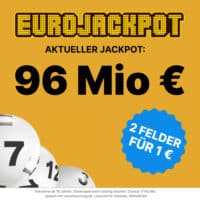 -78% 3 1,00€ 4,65€ [Heute!] 96 Mio. € 🍀💰 2 Felder EuroJackpot für nur 1€ (für Neukunden, staatlich lizenziert) von: tippland.de 1,00€ 4,65€ 3 von: tippland.de 09.07.2024, 13:00 Uhr 3 Update Der Jackpot steigt wieder und ist diesmal mit 96 Mio. € gefüllt. Die nächste Ziehung ist Dienstag um 20:00… Alles lesen