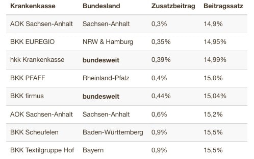 Die günstigste Krankenkasse 2021 erhebt einen Zusatzbeitrag von 0,35% und liegt daher bei 14,95% Beitragssatz. Es handelt sich dabei um die BKK Euregio, die in NRW und Hamburg verfügbar ist. Aber auch die hkk Krankenkasse liegt bei nur 14,99% Gesamtbeitrag und ist bundesweit verfügbar.