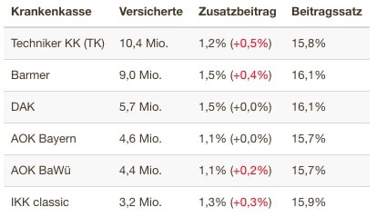 - Mehr als 25 Krankenkassen (darunter Techniker, Barmer, viele AOKs) haben den Zusatzbeitrag teils massiv erhöht.