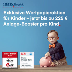 Die 1822direkt (gesprochen: achtzehnzweiundzwanzig direkt) ist eine Tochtergesellschaft der Frankfurter Sparkasse und bietet für euren Nachwuchs in ganz Deutschland ab sofort ein online „Wertpapierdepot für Kinder“ (Depot für Minderjährige) mit einem Anlage-Booster von bis zu 225€ pro Kind an.