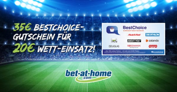Hier bekommen bet-at-home Neukunden ein super Angebot: Bei einem Wetteinsatz von nur 20€ gibt es einen 30€ BestChoice Gutschein von uns als Bonus! Wie immer natürlich unabhängig davon auf wen ihr setzt und wie die Wette ausgeht. Somit habt ihr schon mal 10€ sicheren „Gewinn“ und eben ggf. noch den Gewinn aus der Wette.