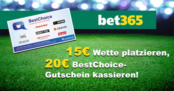 Bet365: 20€ BestChoice-Gutschein für 20€ Wett-Einsatz (Bonus Deal)