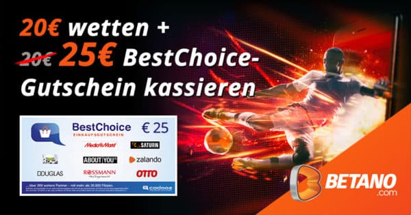 Betano bietet ab sofort einen Bonus Deal für alle Neukunden an: Ihr setzt mindestens 20€ ein und bekommt dafür einen 25€ BestChoice Universal-Gutschein als Bonus! Wer also gut im Kopfrechnen ist, merkt: Euer Einsatz ist schon mal abgedeckt, egal wie eure Wette ausgeht 😉 Und solltet ihr dann auch noch die Wette gewinnen, dann ist das natürlich nochmal entsprechend besser…