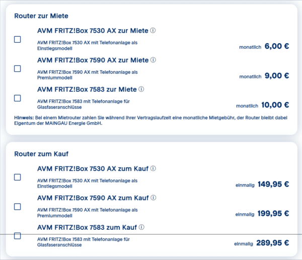 Wie die meisten Anbieter gibt es auch von Maingau leider keinen Router mehr geschenkt, aber ihr könnt auf Wunsch einen mieten oder sogar kaufen. Was sich für euch lohnt müsst ihr dabei selbst entscheiden. Vielleicht habt ihr ja sogar noch einen Zuhause und könnt diesen nutzen.
