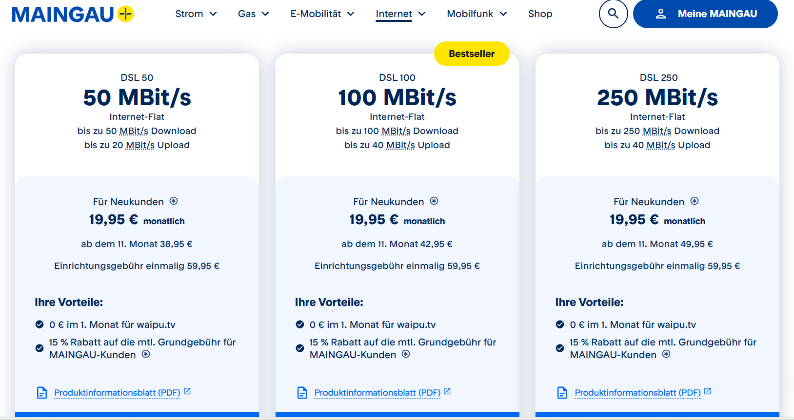 Maingau bietet nicht nur Energie, sondern auch erschwingliche Internet-Tarife über Glasfaser und Kupferkabel an. In den ersten 12 Monaten profitiert ihr von einem stark reduzierten Tarif und zusätzlich wird die Grundgebühr in der aktuellen Aktion für die ersten 2 Jahre um weitere 2-3€ pro Monat gesenkt.
