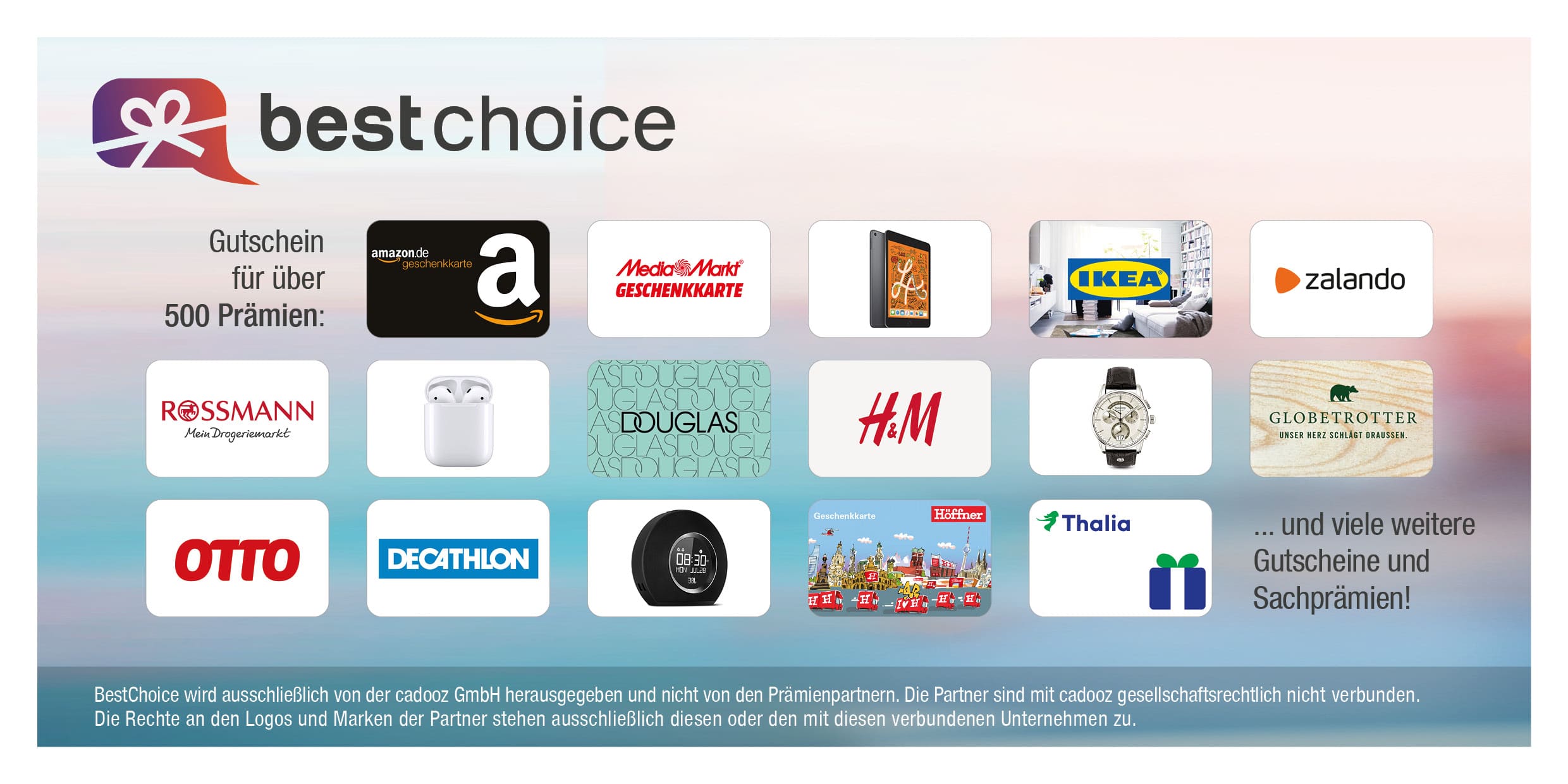 Bei dem Bonus, den ihr nach erfolgter Bestätigung in eurem MyTopDeals-Account abholen könnt, handelt es sich um einen BestChoice Premium Universal-Gutschein. Einlösbar ist dieser z.B. bei Amazon.de, aber auch bei MediaMarkt, IKEA, Decathlon, Zalando, ABOUT YOU, Douglas, OTTO, Rossmann und in über 100 weiteren Shops (weitere Infos: BestChoice Gutschein einlösen - so funktioniert's).