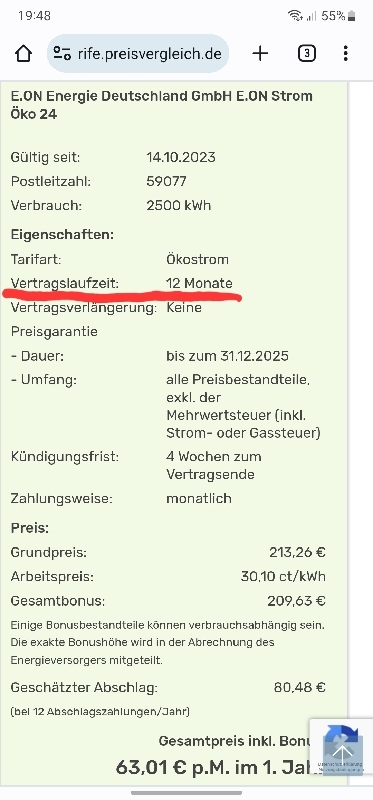 Şiyar49 06.11.2023, 23:06Ich möchte mein Feedback zum Anbieter e-on nochmal aktualisieren. Nach Überprüfung der Vertragsbestätigung ist mir aufgefallen, dass die Mindestvertragslaufzeit nicht wie von mir ausgewählt 12 Monate beträgt. Laut Vertragsbestätigung beträgt die Mindestvertragslaufzeit 23 Monate. Leider habe ich erst nach Ablauf des Widerrufsrechts von 14 Tagen nach Vertragsschluss die Auftragsbestätigung vom 16.10.23 überprüft. Kleingedruckt und verschleiert steht unter 3.9 "Laufzeit und Kündigung", dass die Mindestvertragslaufzeit 24 Monate beträgt. Eine Beschwerde beim Verbraucherschutz habe ich soeben eingereicht und um Prüfung gebeten, ob dieses Vorgehensweise überhaupt zulässig ist. Das Vergleichsportal werde ich bitten, die Angebotenen Tarife von e-on zu überprüfen.