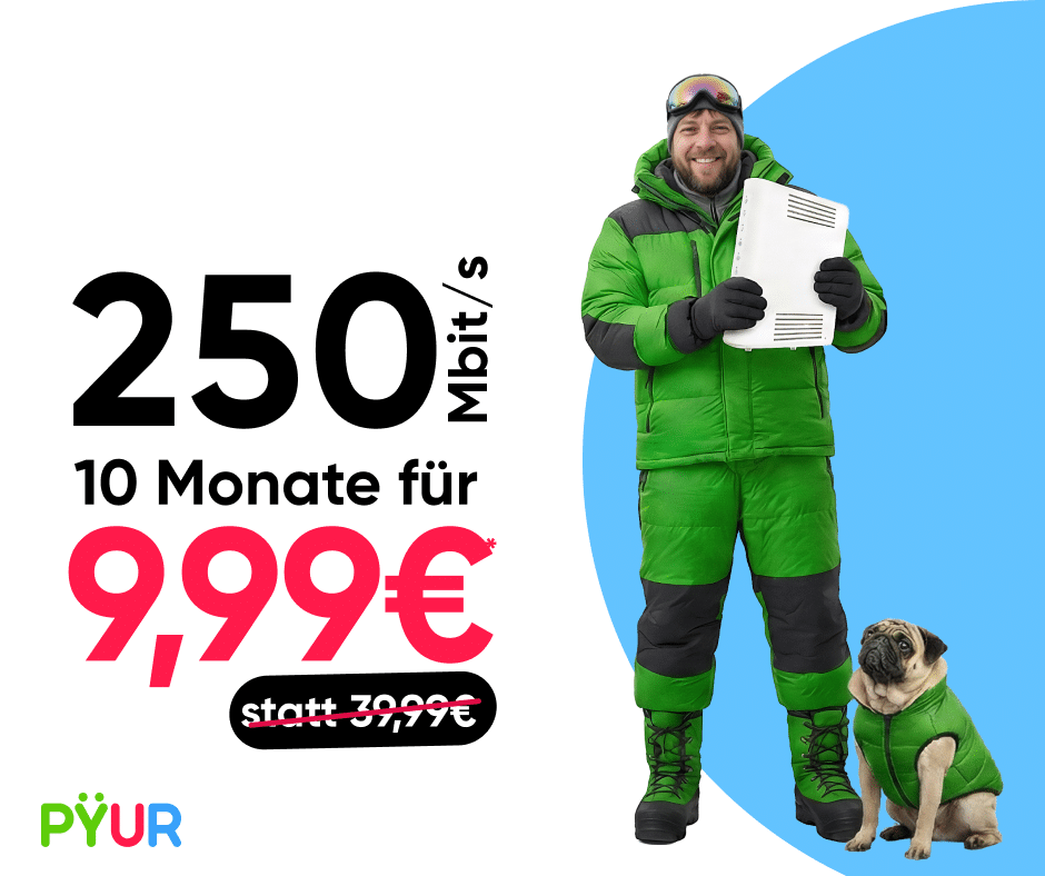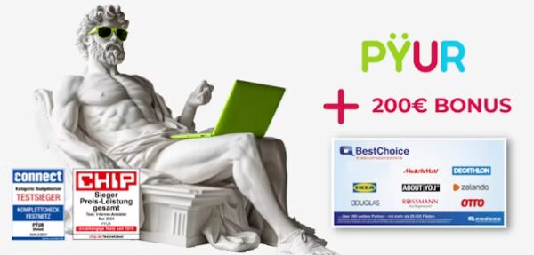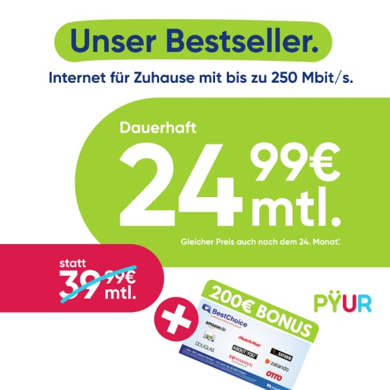 200€ BONUS für PŸUR ✔️ Z.B. Internet mit 250 Mbit/s ab 9,99€ die ersten 10 Monate!