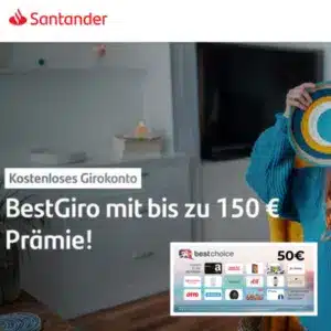 Lust auf ein fettes Extra-Taschengeld? Die Santander haut gerade wieder richtig einen raus! Wenn ihr euch das kostenlose BestGiro (oder BestGiro für Studenten) sichert, könnt ihr insgesamt bis zu 150€ Prämie einsacken150€ Willkommensbonus – So geht’s: