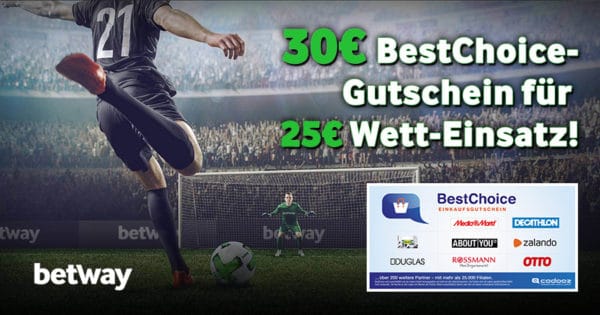 Bei betway bekommt ihr jetzt wieder die Chance, quasi gratis Sportwetten abzuschließen: Alle Neukunden bekommen nämlich alleine für 25€ Einsatz in diesem Bonus Deal einen 30€ BestChoice-Gutschein als Bonus (ihr habt alleine damit also schon 5€ Gewinn gemacht). Zusätzlich bekommt ihr auch noch 100% Bonus auf das eingezahlte Guthaben (bis max. 150€), falls gewünscht: