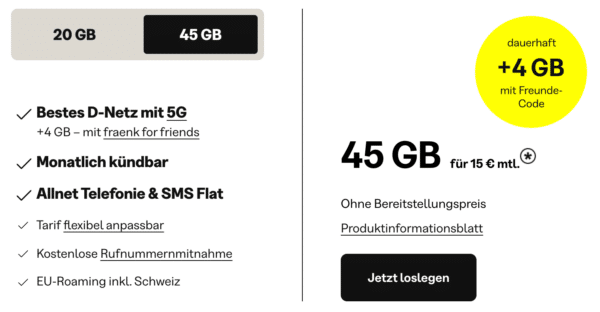 🚨 fraenk 49GB 5G Allnet-Flat im Telekom-Netz (mtl. kündbar!) für 15€ mtl. 🔥 EU-Roaming inkl. Schweiz!