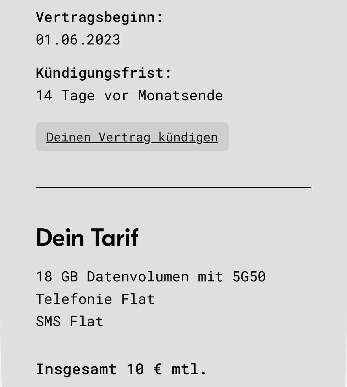 SAKA San 29.08.2025, 20:49Als Bestandskunde kann man bei Bedarf grundsätzlich eine Option mit zusätzlich 25 GB für 5€ monatlich buchen und diese auch monatlich wieder abbestellen. In meinem Fall beispielsweise wären das insgesamt dann 43 GB für 15€ monatlich, da ich momentan für 18 GB 10€ bezahle. Da ich zuhause wlan habe, verbrauche ich mobil überschaubare 10 GB, eher weniger.