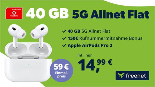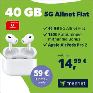 Freenet liefert grade den nächsten Vodafone Deal: Ihr bekommt die Apple AirPods Pro 2 Gen mit USB-C Case für einmalig 59€ inkl. Versand mit einer 40B LTE/5G Allnet-Flat für 14,99€ im Monat. Dann ergibt sich eine effektive Rate nach Idealo von 2,90€ pro Monat dank 150€ Bonus für eure Rufnummer!