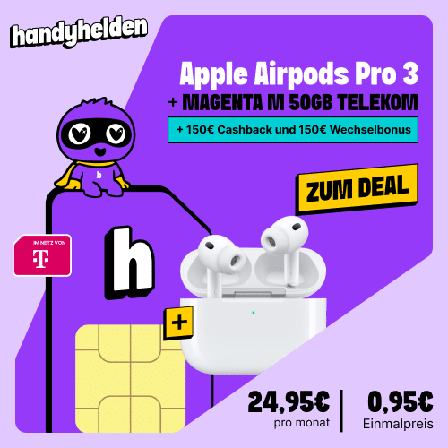 Wer immer noch auf Apple AirPods Pro 3 wartet und auch einen Premium-Tarif dazu sucht, der sollte mal bei Handyhelden schauen. Dort gibt es den Telekom Magenta Mobil M mit Apple AirPods Pro 3 zu top Konditionen. Details und Rechnung findet ihr unten, und auch die easy Konditionen für Bonus und Cashback. 🙂