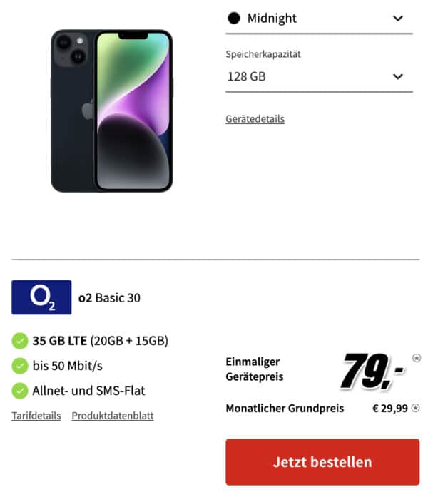 MediaMarkt hat wieder einen coolen Tarif mit dem Apple iPhone 14 am Start: Ihr bekommt das iPhone im o2 Basic 30 mit 35GB LTE Allnet Tarif für einmalig 79€ Zuzahlung. Der Tarif kostet euch 29,99€ monatlich. Klingt erstmal happig aber für Apple Verhältnisse wirklich in Ordnung!