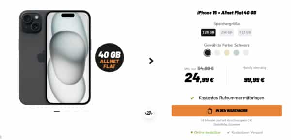 Falls ihr ein Auge auf das iPhone 15 geworfen habt: Bei Klarmobil gibt es nur für kurze Zeit die Klarmobil Allnet-Flat mit 40GB 5G für 24,99€ im Monat und das iPhone für 99,99€ dazu. Schaut also mal rein – nur gültig solange der Vorrat reicht:- Tarif eff. GRATIS