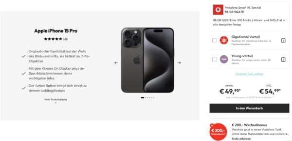 Apple iPhone 15 Pro für 49,95€ 📲 Vodafone Smart XL mit 95GB 5G für 54,99€ mtl. mit 200€ Bonus!