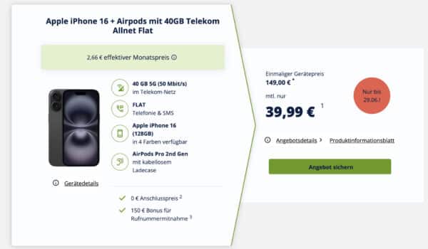 [Vorbei][Tarif eff. 2,66€!] Apple iPhone 16 + AirPods Pro 2 für 149€ mit 40GB 5G Telekom Allnet für 39,99€ mtl. + 150€ RNM