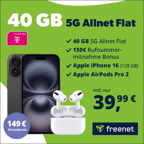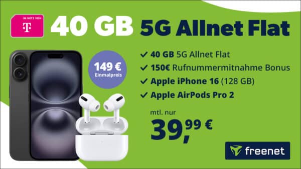 Freenet liefert grade den nächsten Telekom Deal: Ihr bekommt das Apple iPhone 16 + AirPods Pro 2 für einmalig 149€ inkl. Versand mit einer 40GB LTE/5G Allnet-Flat für 39,99€ im Monat. Dann ergibt sich eine effektive Rate nach Idealo von 2,66€ pro Monat dank 150€ Bonus für eure Rufnummer!