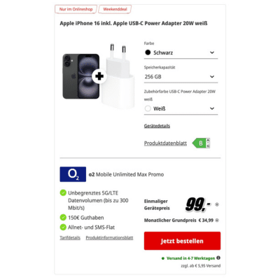 MediaMarkt bietet einen super Deal für das iPhone 16 an! Ihr könnt das iPhone 16 (diesmal mit 256GB Speicher) für einmalig 99€ bekommen. Das Ganze gibt’s mit Unlimited Datenvolumen für 34,99€ mtl. Da das iPhone 16 mit 256B laut Idealo über 840€ kostet, landet ihr bei einem effektiv kostenlosen Tarif (siehe Rechnung unten).