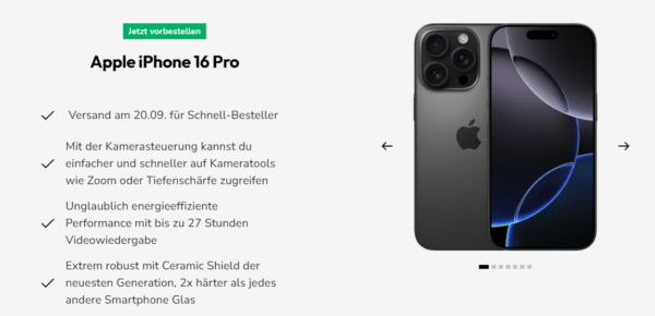- 1x iPhone 16 Pro für 299,95€ Zuzahlung (Wert: 1199€)