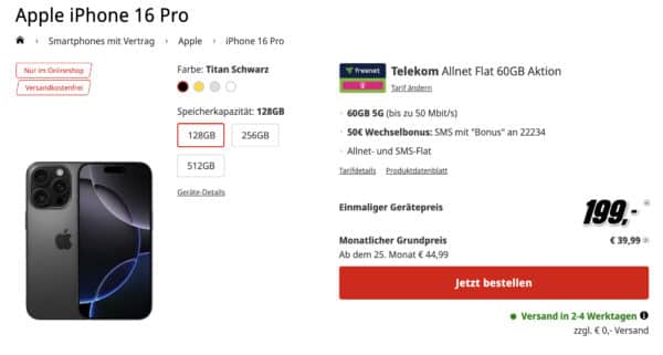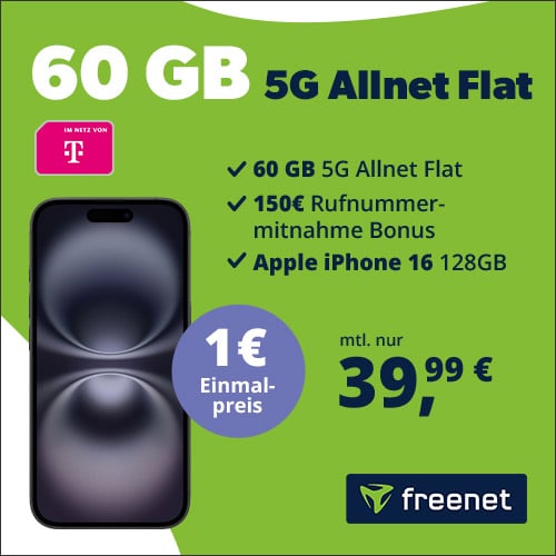 [Eff. 0,70€] 🔥 Apple iPhone 16 für 1€ mit 60GB 5G Telekom Allnet für 39,99€ mtl. + 150€ Bonus