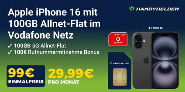 Eff. 0,82€ 🔥 Apple iPhone 16 für 99€ mit 100GB Vodafone 5G für 29,99€ mtl. (keine AG) + 100€ Bonus