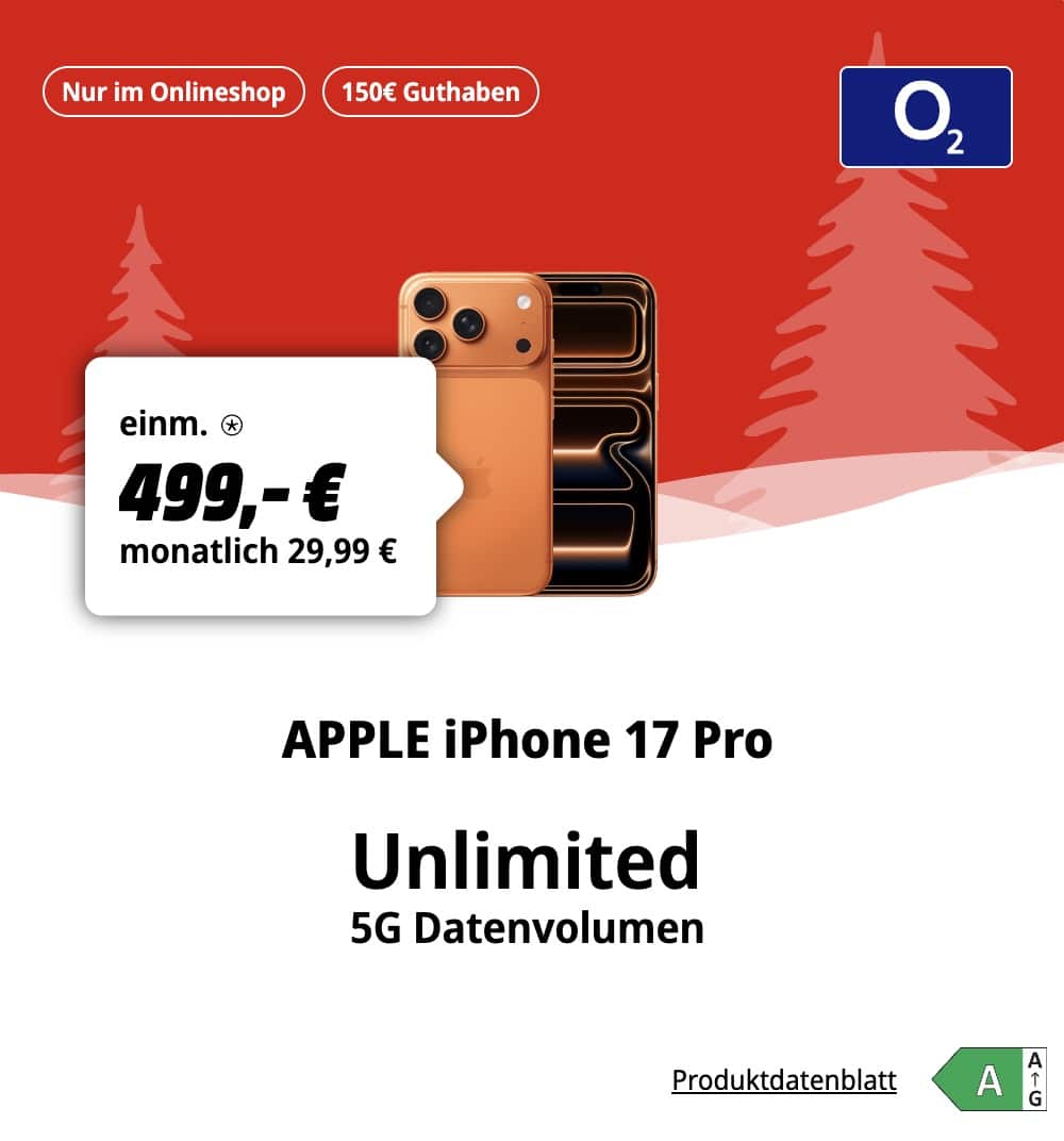 MediaMarkt bietet einen weiteren super Deal für das iPhone 17 Pro an! Ihr könnt das iPhone 17 Pro für einmalig 499€ bekommen. Das Ganze gibt’s mit Unlimited Datenvolumen für 29,99€ mtl. Zudem gib es noch 6 Monate ChatGPT+ geschenkt!