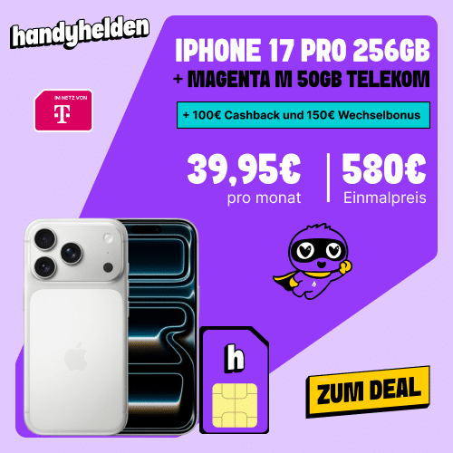 Handyhelden liefert grade den nächsten Telekom Deal: Ihr bekommt das Apple iPhone 17 Profür einmalig 580€ mit einer 50GB 5G Allnet-Flat für 39,95€ im Monat. Dann ergibt sich eine effektive Rate nach Idealo von 5,41 pro Monat dank 150€ Bonus für eure Rufnummer und 100€ Cashback!