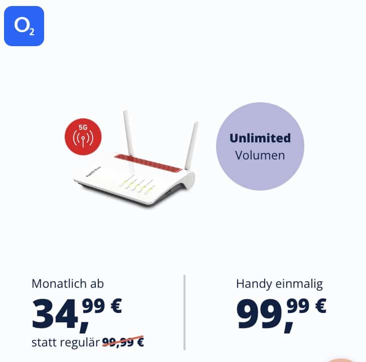 Ein Hammer-Tarif für die Heavy-User unter euch oder jene, die mit einem Trick die AVM FRITZ!Box 6850 5G v2 günstig abstauben wollen: Der o2 Free Unlimited mit unbegrenztem Daten-Volumen und 5G/LTE bis zu 300 Mbit/s. Endlich! Komplett ohne Einschränkungen surfen, streamen, etc. gibt’s hier zum Preis von 34,99€ im Monat – und das sogar monatlich kündbar! Dazu gibt es für 199,99€ die AVM FRITZ!Box 6850 5G v2 (Wert: 399€) – bei 274,97€ Gesamtkosten, wenn ihr nach 1 Monat wieder kündigt, dann spart ihr hier fette 124,03€ gegenüber dem Idealo Bestpreis!