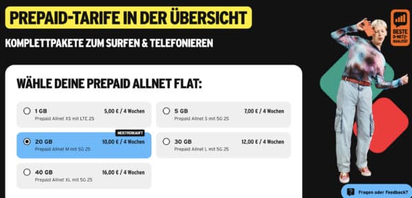 Hey, ihr seid auf der Suche nach einem flexiblen Prepaid-Tarif? Hier kommt der perfekte Deal: Bei der Bestellung einer Congstar Prepaid-Karte zahlt ihr einmalig den Starterpaket-Preis von nur 1€ und bekommt dafür direkt Startguthaben in Höhe von den monatlichen Tarifkosten auf eure Karte!Das reicht erstmal für die ersten 4 Wochen, in denen ihr das volle Paket mit 5G und einer Telefonie- und SMS-Flat in alle deutschen Netze nutzen könnt. Jedes Jahr gibt’s zusätzlich 1 GB monatlich mehr in eurem Tarif – so wächst ihr mit der Zeit.. Ihr surft und telefoniert im besten Telekom-Netz – hier die Details: