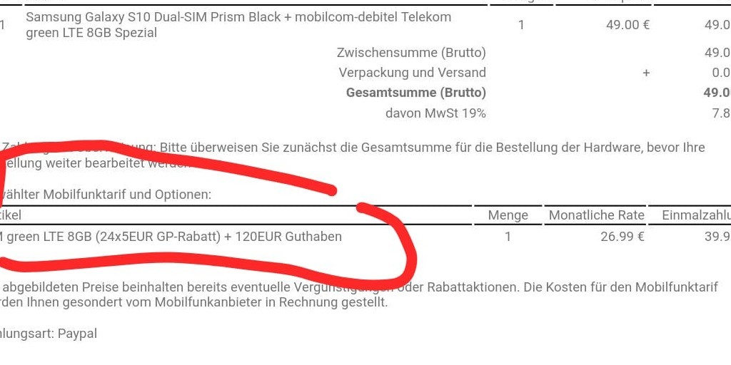 Stefan S. 25.07.2019, 08:52@oladeluxe: Der Tarif ist um 5€ rabattiert und dazu gibt es nochmal 120€ Guthaben (= 24x 5€ Rabatt), das automatisch verrechnet wird. D.h. die ersten paar Monate kommen 0€ Rechnungen, danach werden 31,99€ abgebucht.